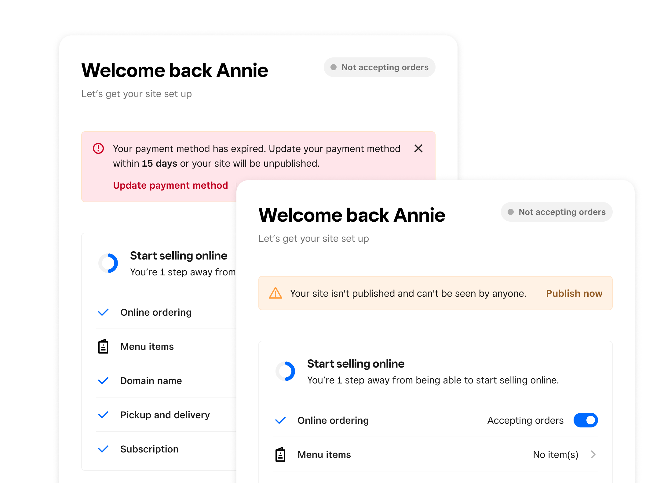 We implemented a grace period before automatically downgrading the account. Custom domains presented a unique challenge, and after exploring alternatives, we opted to unpublish the site and provide a contextual 404 experience that directs sellers toward resolution.